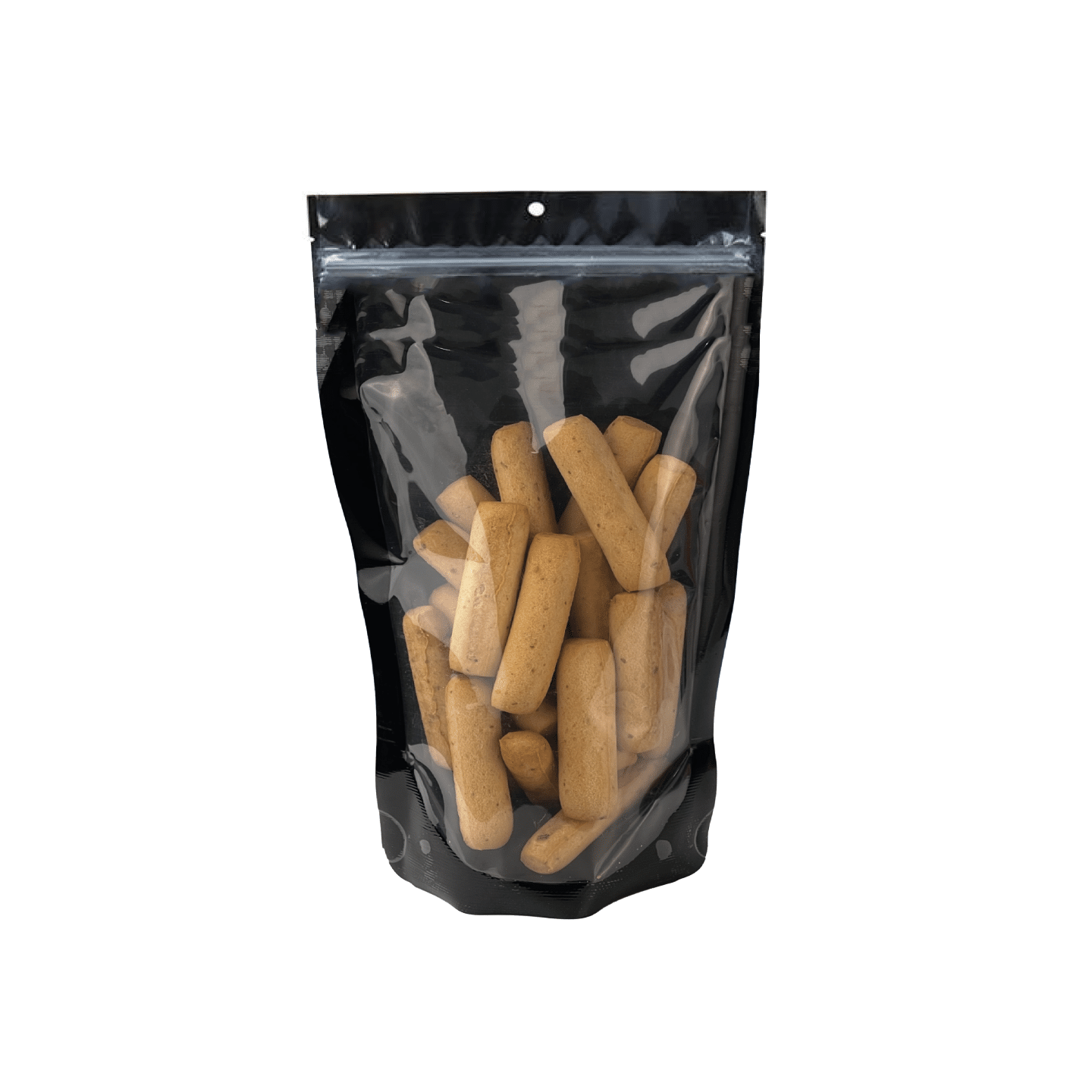 Les sacs Doypack transparent / noir ou les sacs souples stand-up sont fabriqués avec différentes combinations de matériaux laminés entre eux et ont un pli dans le fond. Ils constituent un emballage moderne et fonctionnel.